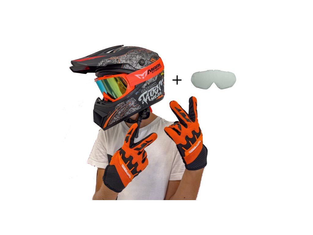 Zvýhodněný set, který obsahuje crossovou helmu, rukavice a ochranné brýle + čiré slko.