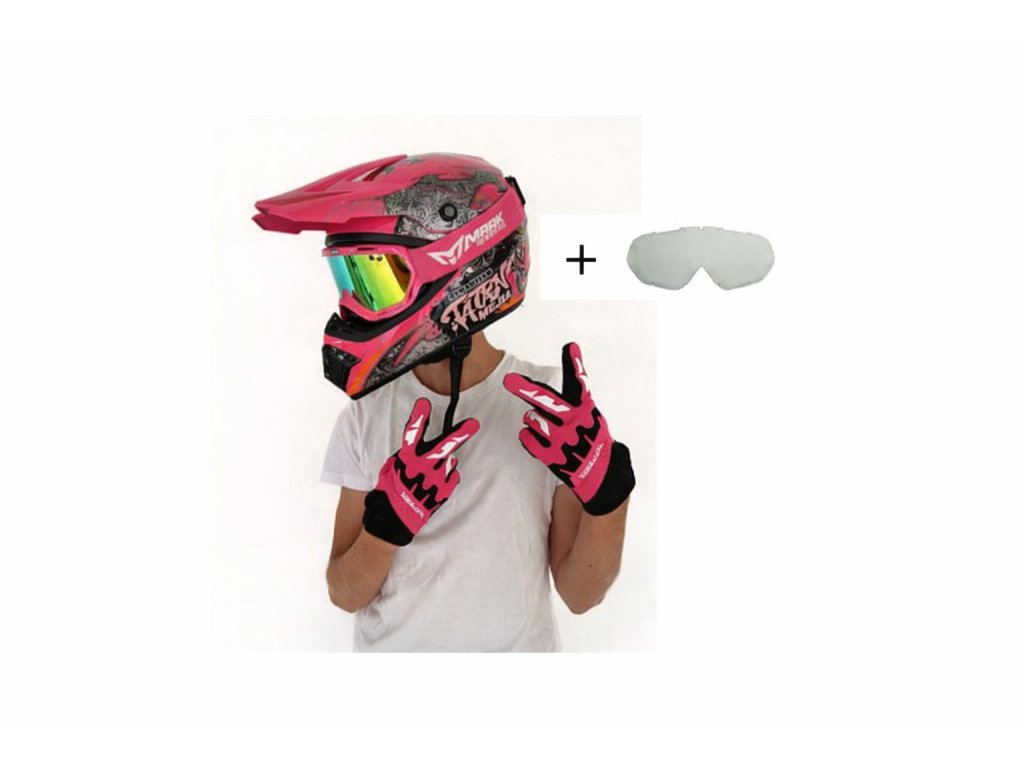 Zvýhodněný set, který obsahuje crossovou helmu, rukavice a ochranné brýle.