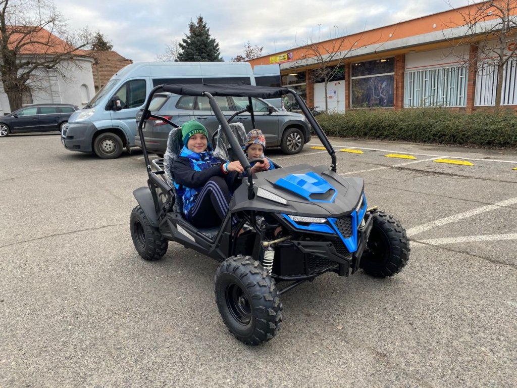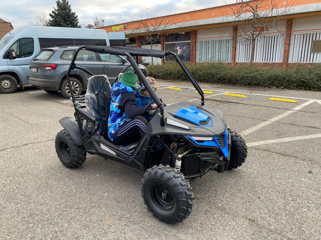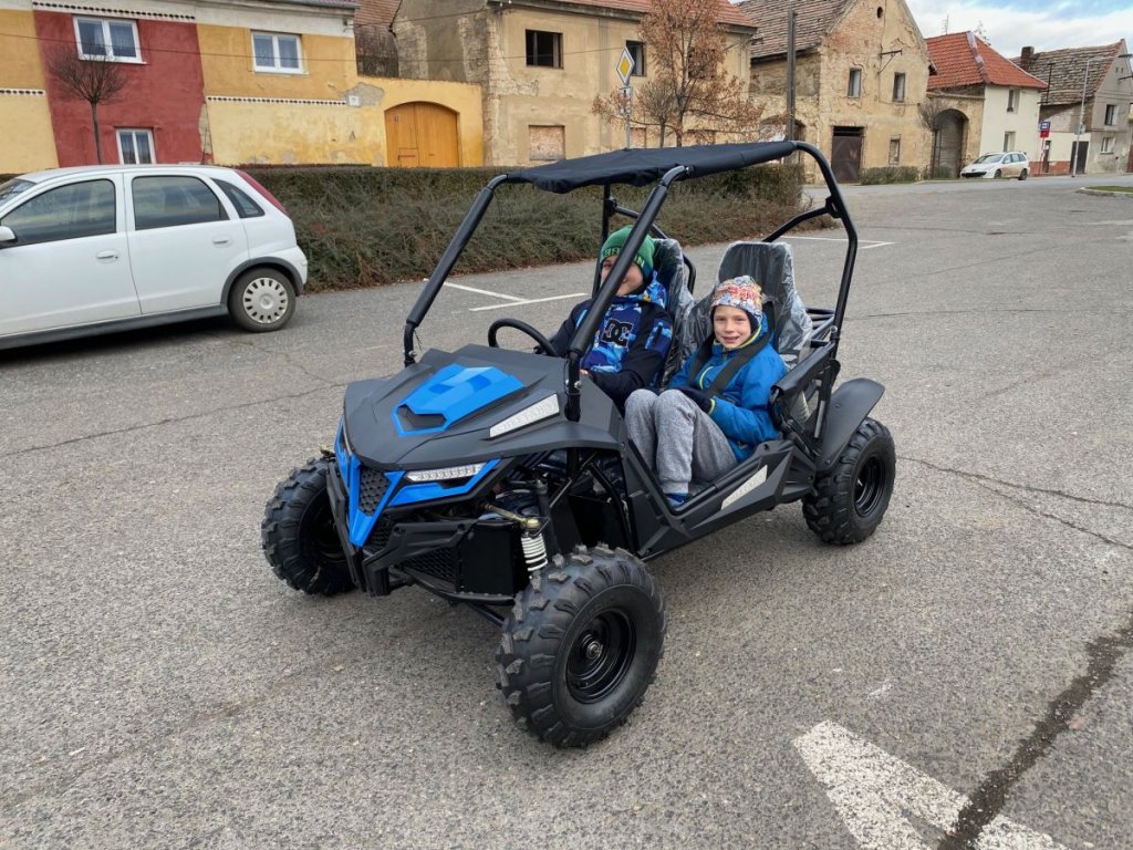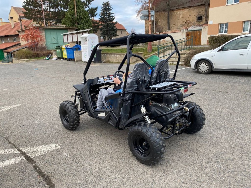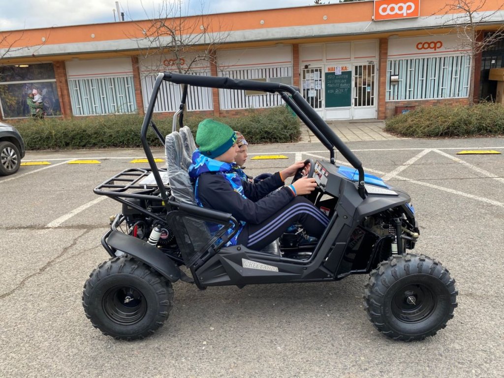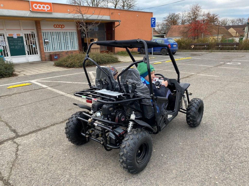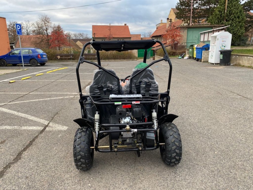 Dětská buggy - doporučený věk 5-13 let, 4-taktní motor, automatické řazení, elektrický startér + startovací šňůra, objem 208 ccm, výkon 6 kW, kvalitní 8" kola, doporučená maximální hmotnost jezdce 90 kg, palivo Natural 95