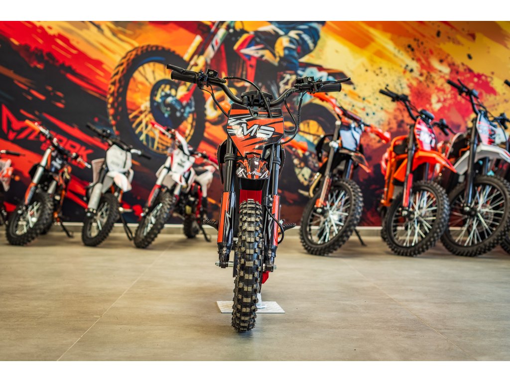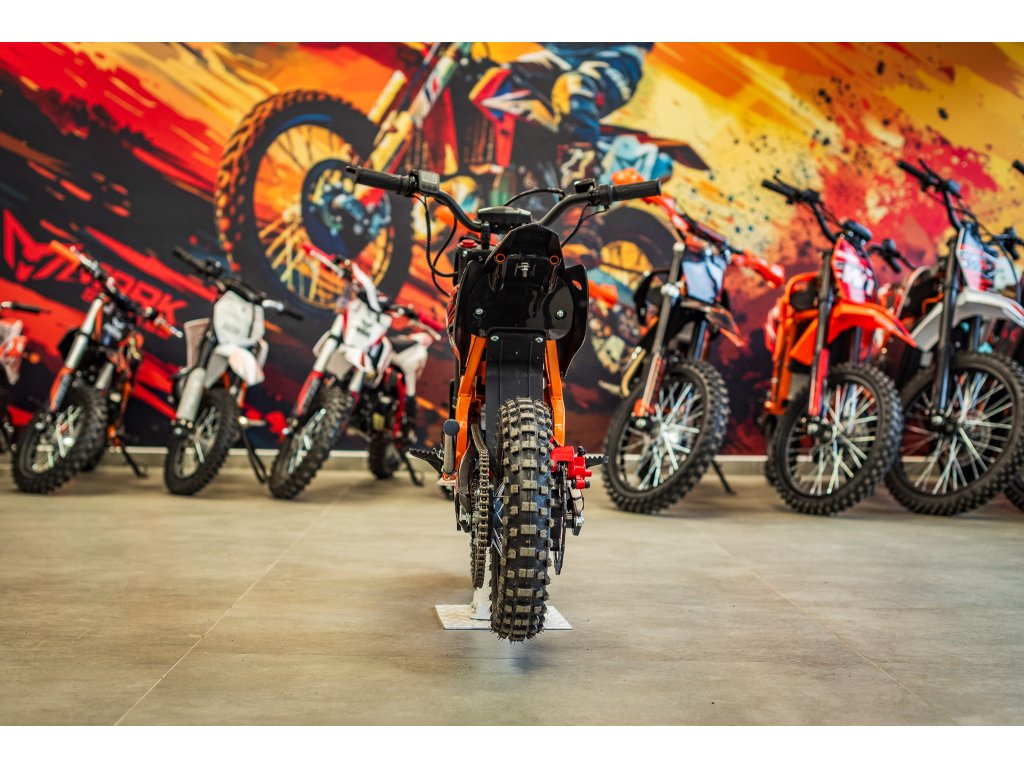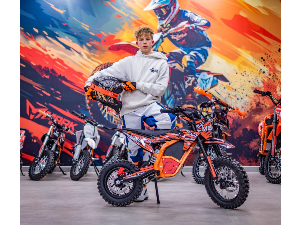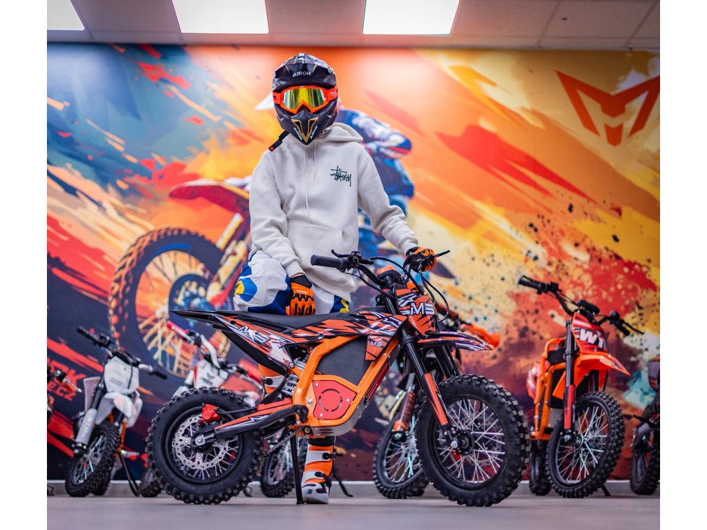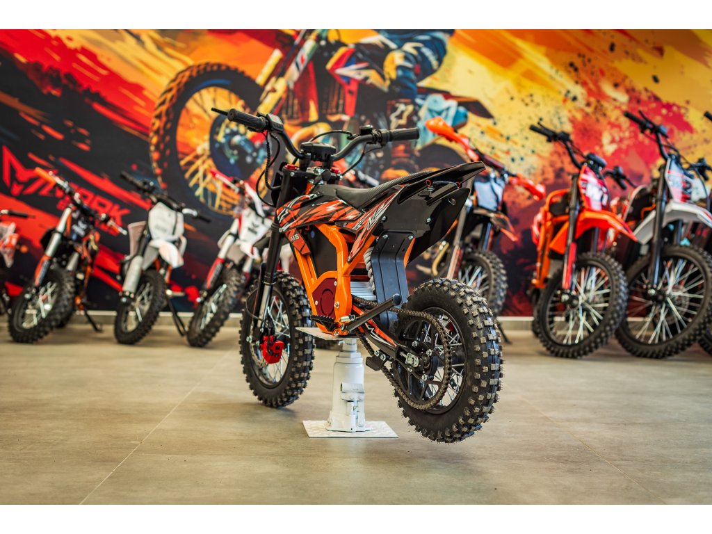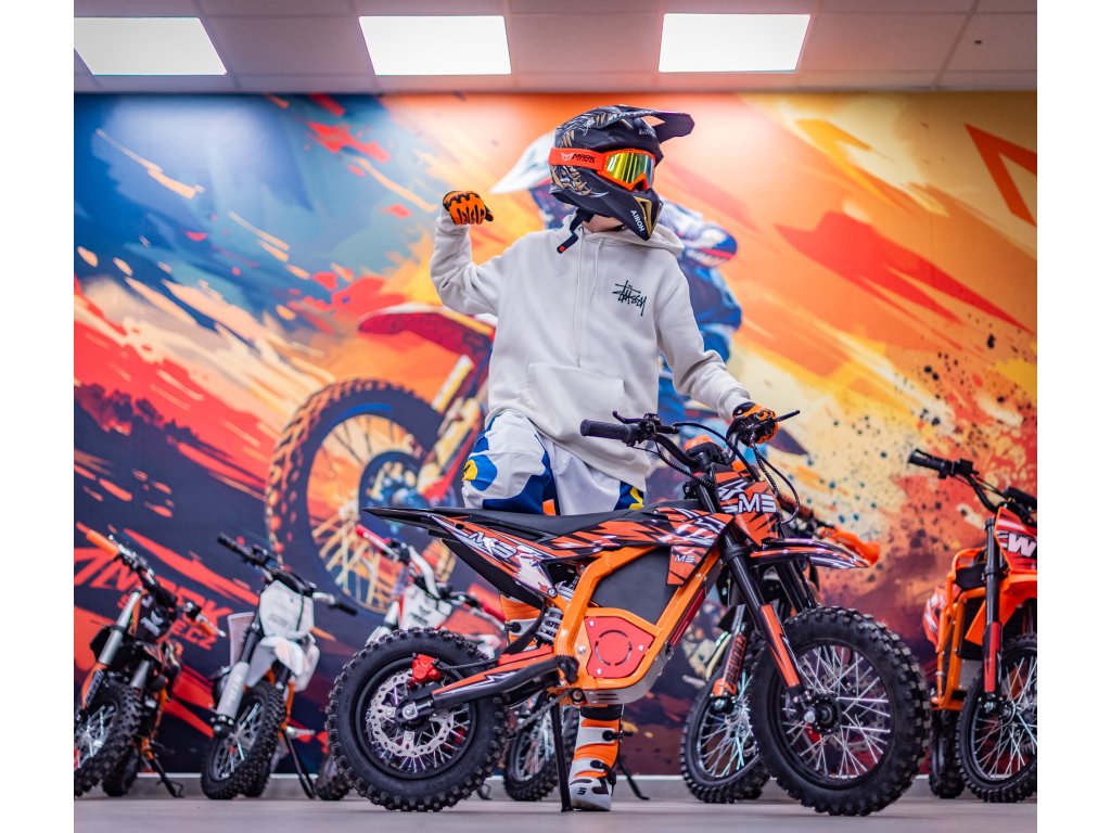 Jedná se o výkonný elektro pitbike pro děti 5-8let. Na fotce je Ondra 12 let 165cm. Poháněn je bezkartáčovým motorem s výkonem 1300W, který je zárukou svižného zrychlení. Rozpohybovat motorku zvládne až na 45km/h. Doplněn je lithiovou baterií 48V s kapacitou 18Ah, která zaručuje dostatečný dojezd. Dojezdová vzdálenost je u tohoto motocyklu až 30km (záleží na zatížení a terénu).