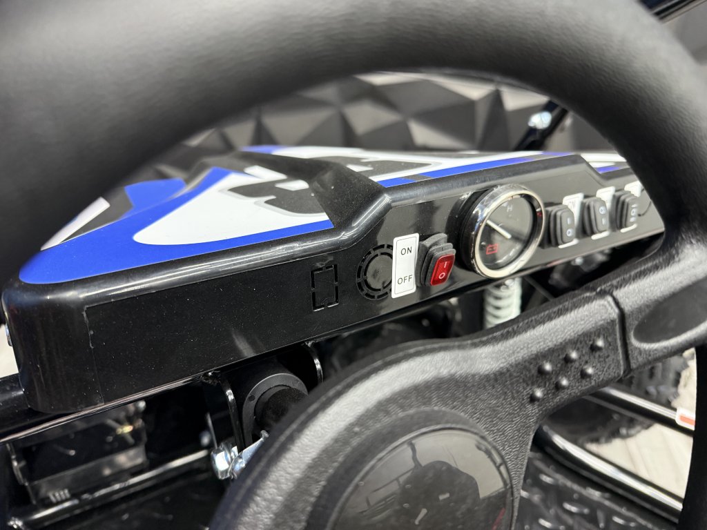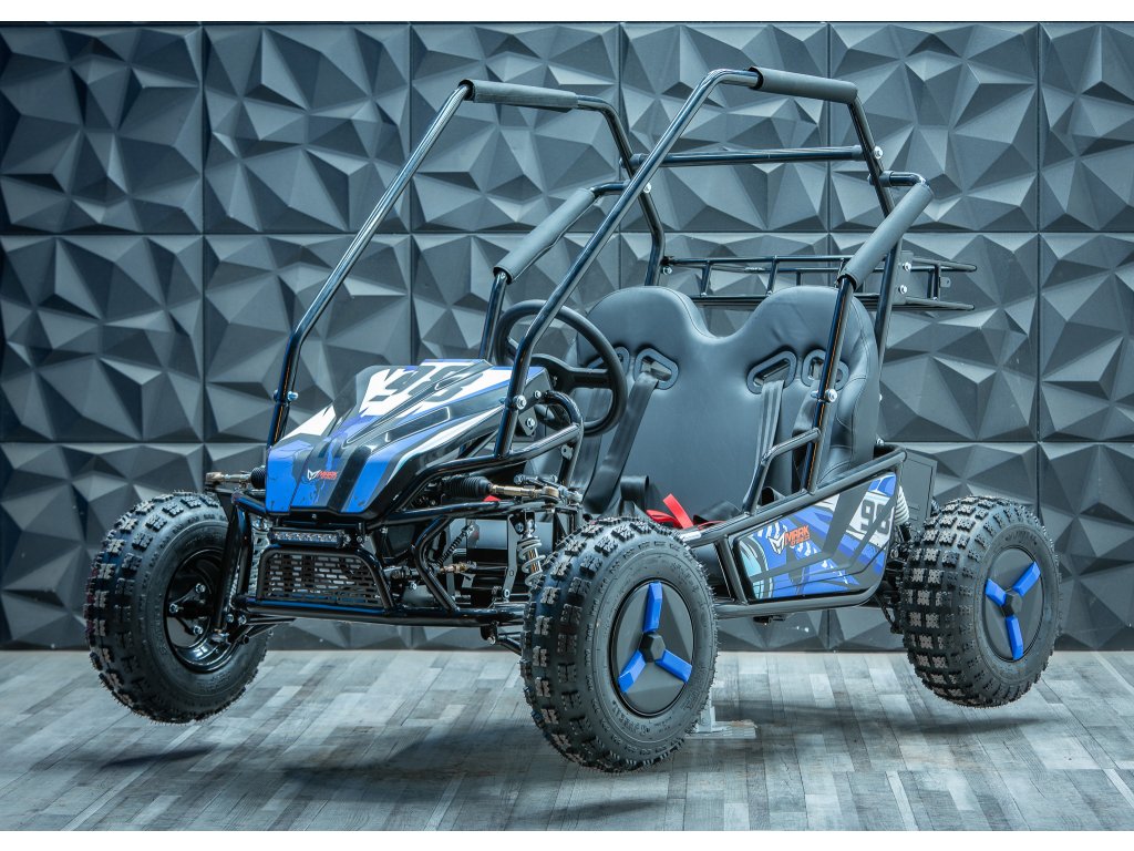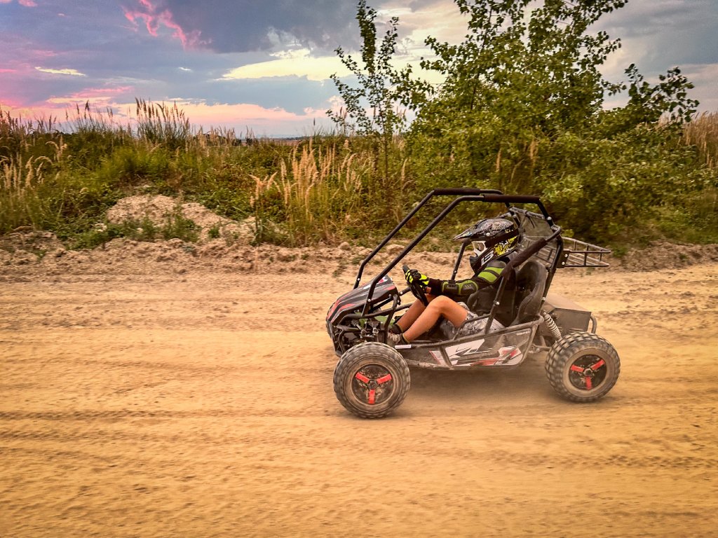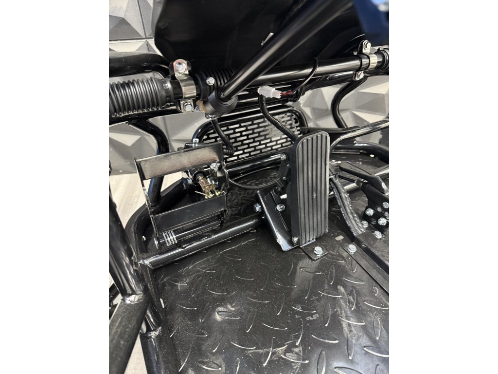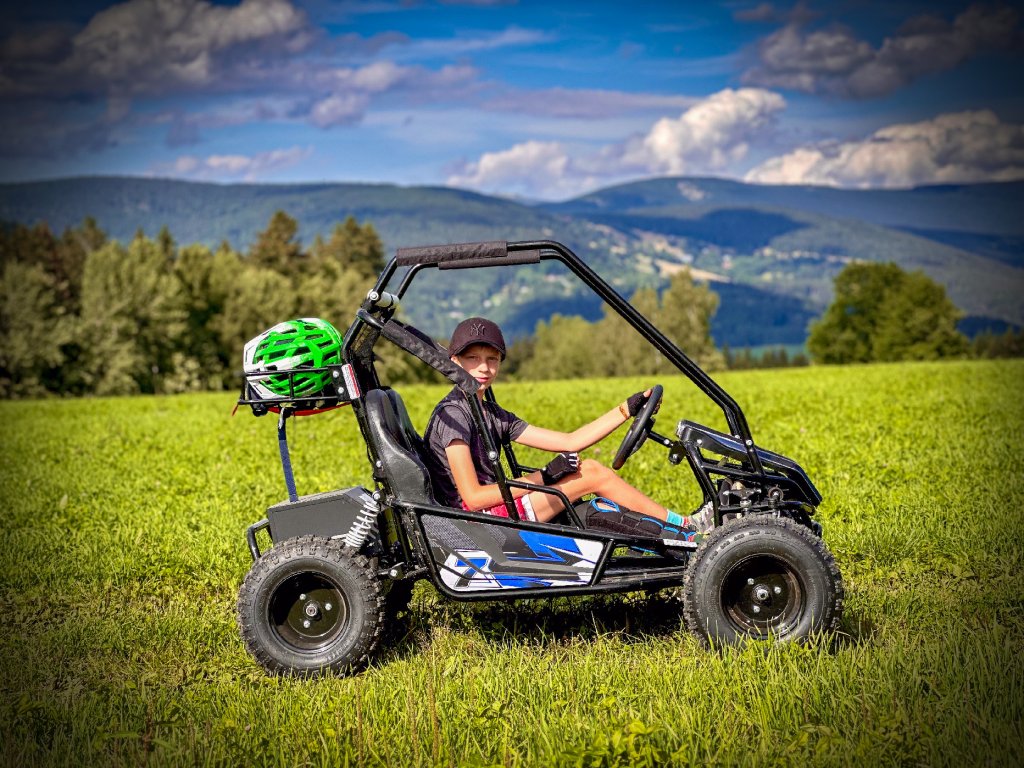 Tato Buggyna má zadní hydraulickékotoučové brzdy. Vybavili jsme ji LED diodovými světly, které skvěle posvítí na cestu a nejsou jen na oko. Určitě doporučujeme přikoupit i dětskou helmu i vhodné oblečení. Bugy je vybavena 3 polohovým voličem rychlostí a nožní i ruční brzdou.
