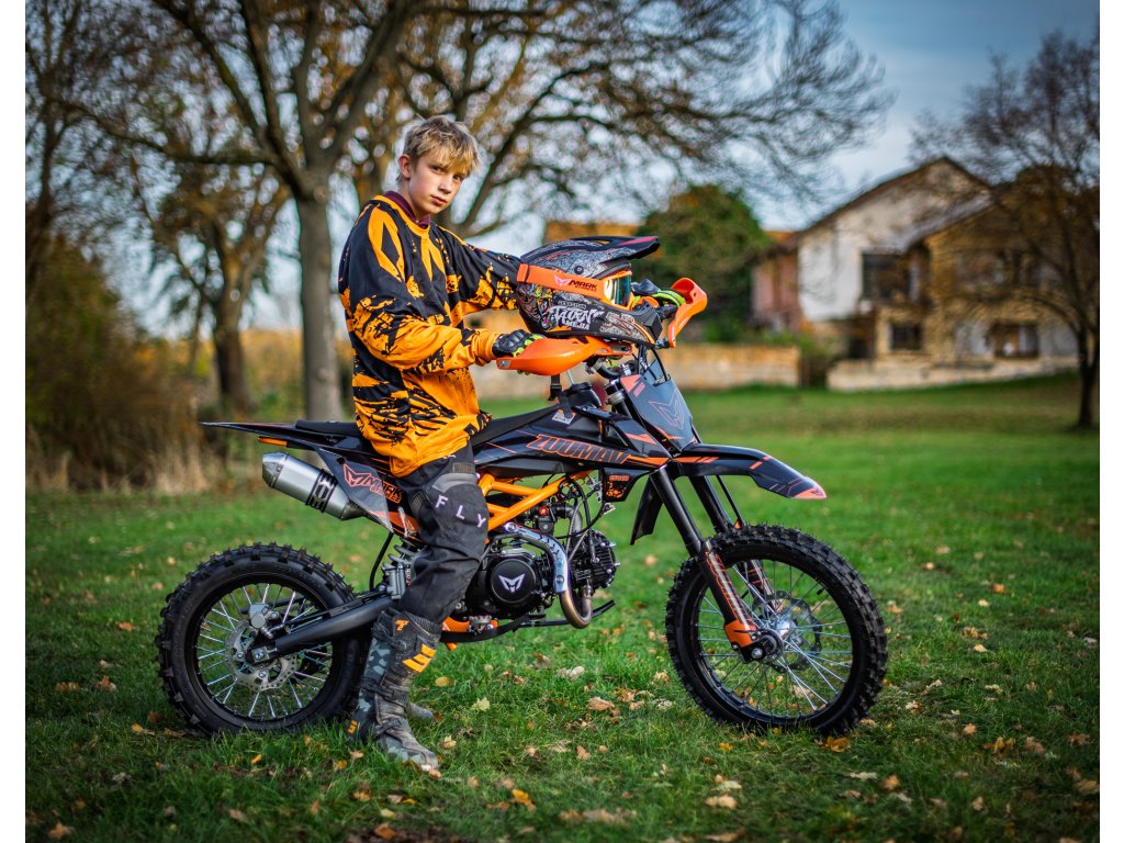 Dětský motocykl - doporučený věk 9-14 let, 4-taktní motor, 4 rychlosti se spojkovým řazením, objem 140 ccm, výkon 11 kW, kvalitní 17" a 14" kola, doporučená maximální hmotnost jezdce 85 kg, palivo Natural 95