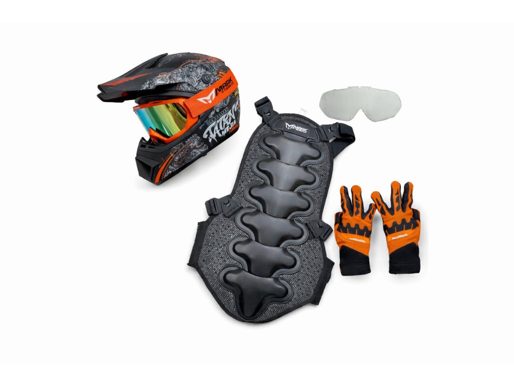 Stylový motokrosový set v oranžovém designu. Helma, brýle, rukavice a chránič páteře pro maximální ochranu i drsný vzhled na trati.