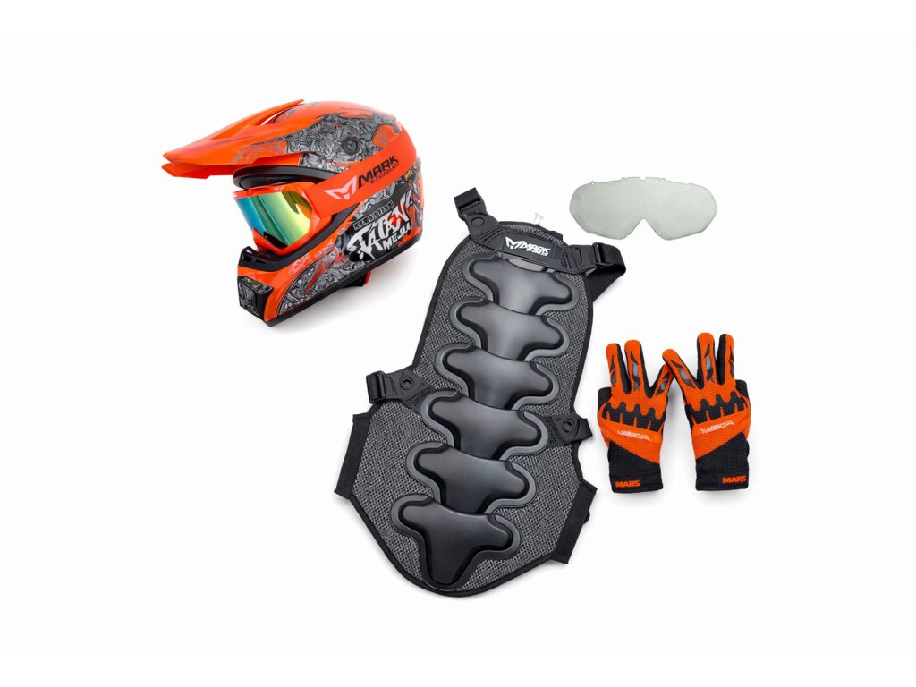 Zvýhodněný set, který obsahuje crossovou helmu, rukavice, ochranné brýle a chránič páteře.