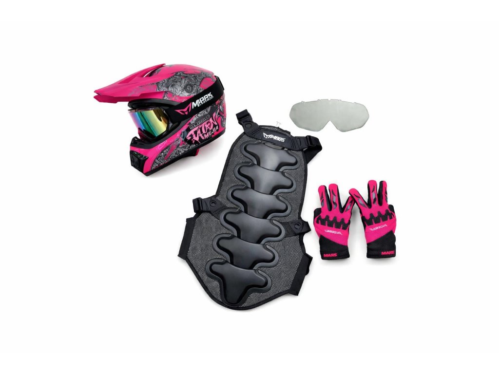 Stylový motokrosový set v růžovém designu. Helma, brýle, rukavice a chránič páteře pro maximální ochranu i drsný vzhled na trati.