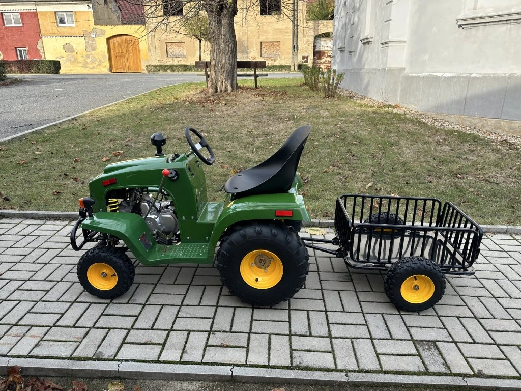 Zahradní traktor s přívěsem 110 ccm - zelený Model 2026 prodloužená zadní náprava pro lepší stabilitu